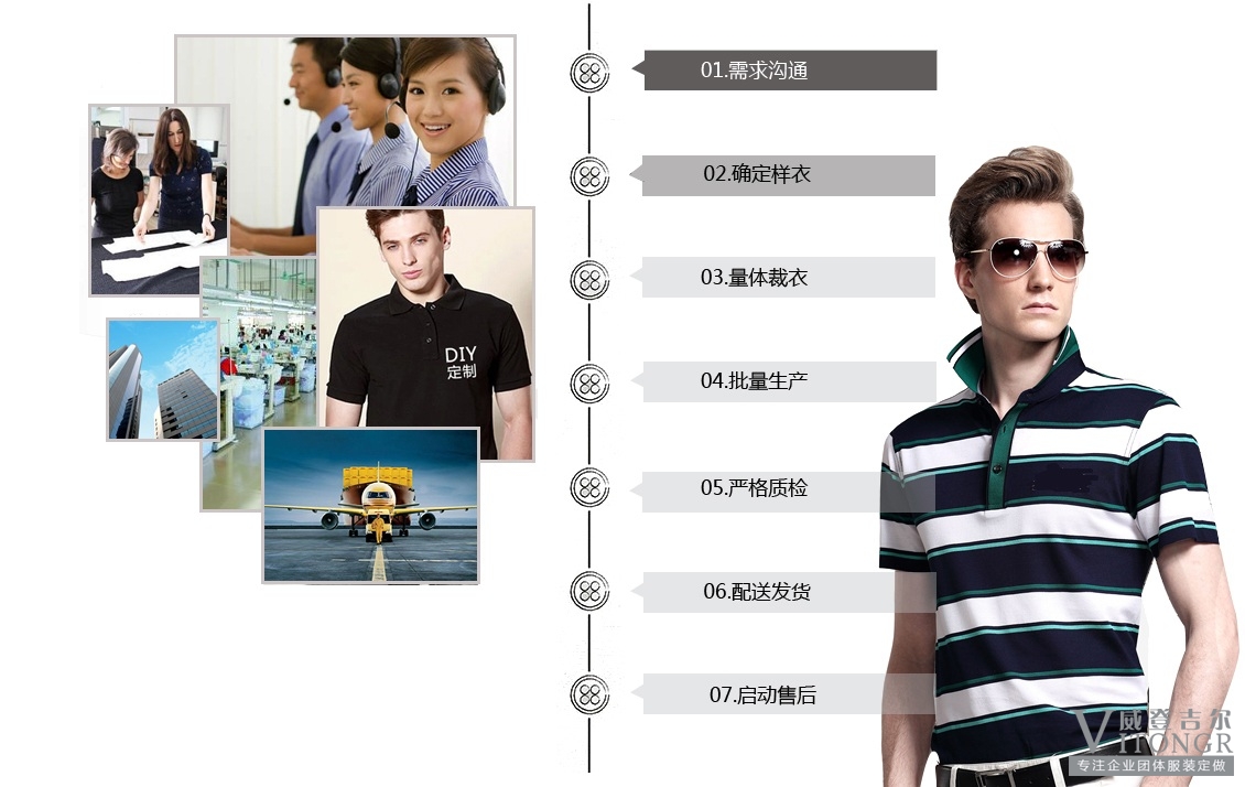 定做流程:業(yè)務(wù)溝通—寄送樣衣—確定款式—確定面料—確定價格—簽訂協(xié)議—支付定金—下單生產(chǎn)—包裝送貨—驗收付款—售后服務(wù)。